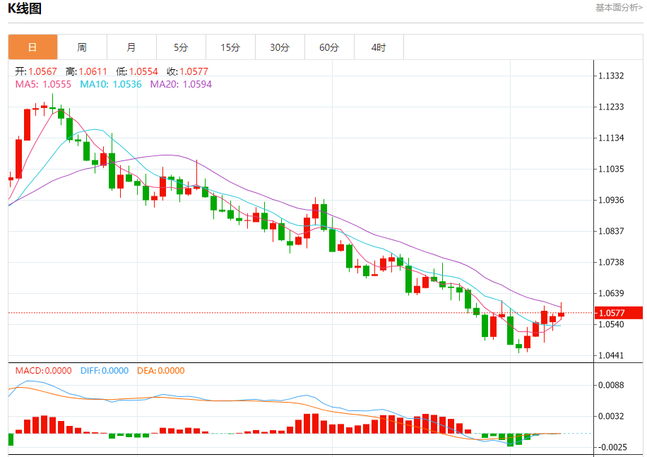 周二欧市盘中,欧元兑美元交投于1.0578,涨幅为0.10%。