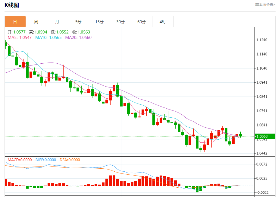 周三欧市盘中,欧元兑美元交投于1.0563,跌幅为0.14%。