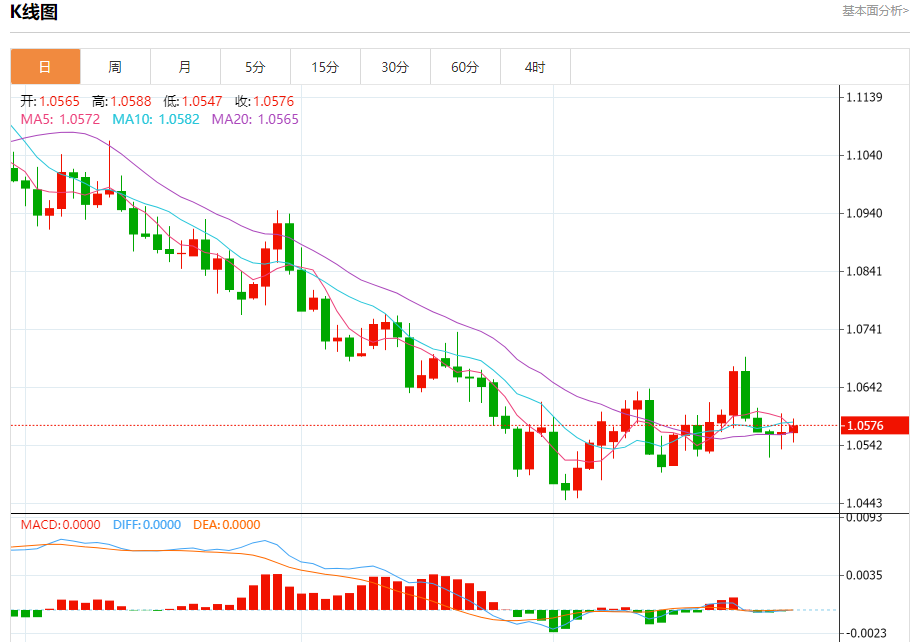 今日周一,截止目前欧元兑美元报1.0577,上涨0.11%。