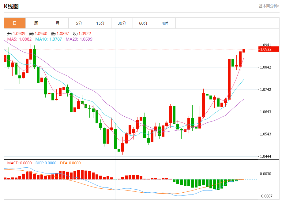 今日周一,截止目前欧元兑美元报1.0923,上涨0.09%。