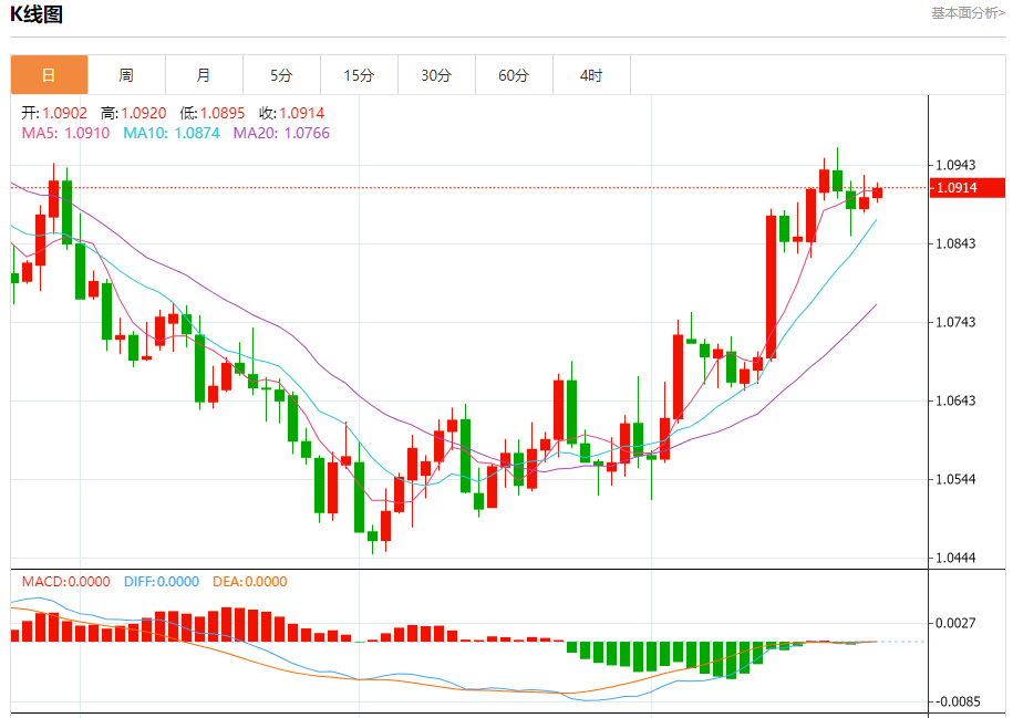今日周五,截止目前欧元兑美元报1.0914,上涨0.10%。