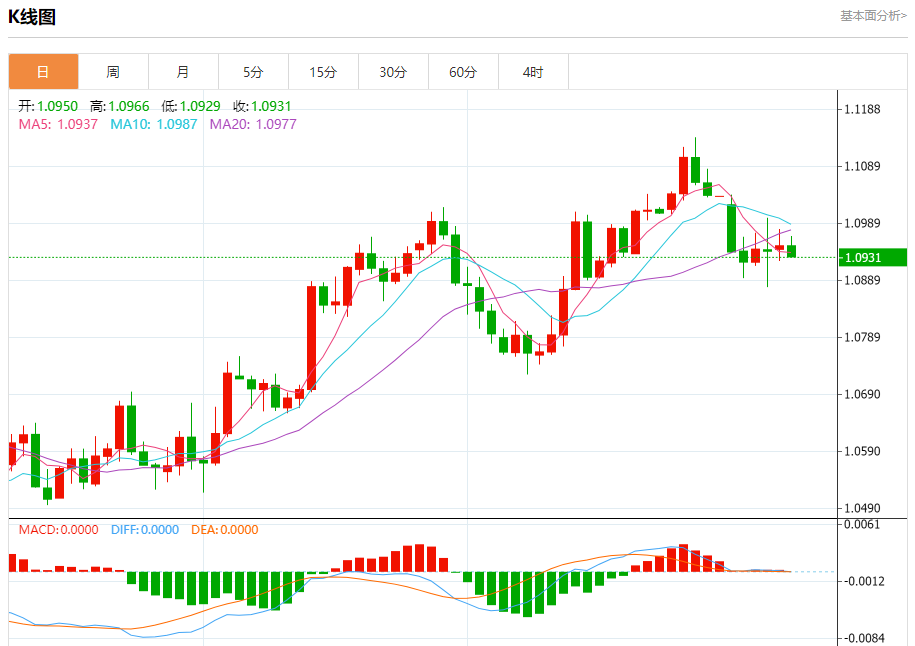 周二欧市盘中,欧元兑美元交投于1.0930,跌幅为0.19%。