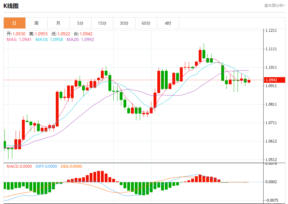 今日周三,截止目前欧元兑美元报1.0943,上涨0.11%。