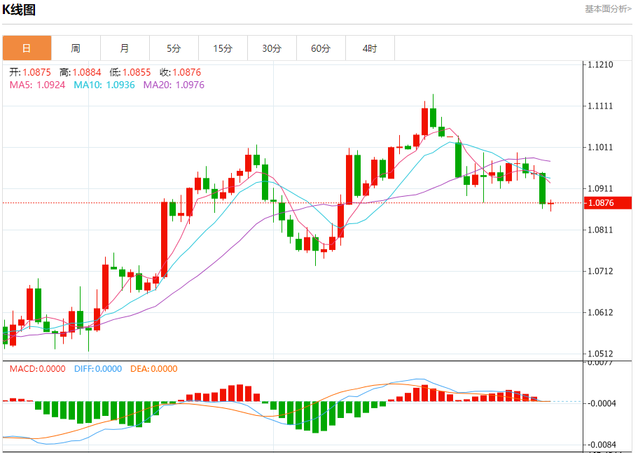 周三欧市盘中,欧元兑美元交投于1.0878,涨幅为0.03%。