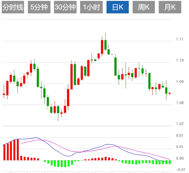 日K线显示,随着大盘动能向中间倾斜,欧元/美元紧缩在中档,该货币对在50日均线和200日均线之间的拥堵区域分别在1.0925和1.0850附近徘徊。