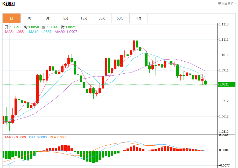 周一欧市盘中,欧元兑美元交投于1.0823,跌幅为0.28%。