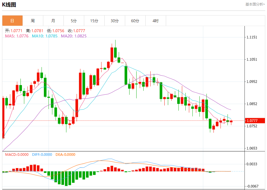 今日周二,截止目前欧元兑美元报1.0779,上涨0.06%。