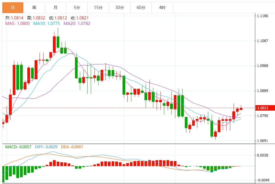 日K线使该货币对在1.0830附近撞上200日均线,上方动能面临重大技术天花板。欧元/美元仍面临高点下降的模式,该货币对仍较12月1.1140附近的峰值下跌约3%。