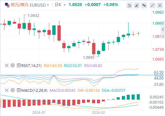 欧元/美元触及上升趋势线支撑1.0820附近后反弹。此外4小时图上的RSI在上周五跌向50后上升至60。这些发展表明多头仍有兴趣。