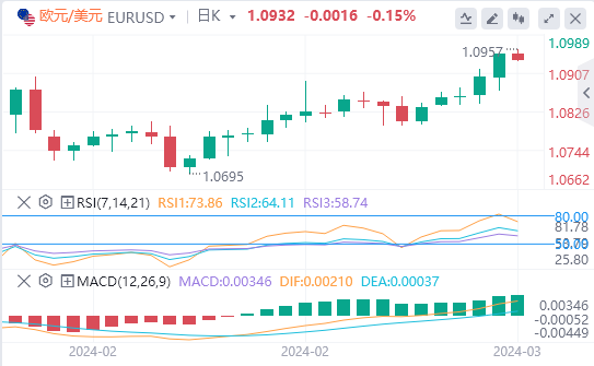 美国劳工统计局将在晚些时候公布2月份的劳动力市场数据。预计非农就业人数(NFP)将增加20万人。CMEFedWatch工具目前显示,市场对美联储6月降息的定价概率超过80%。如果非农人数低于15万,令人失望,那么最初的反应可能会打压美元,帮助欧元/美元走高。