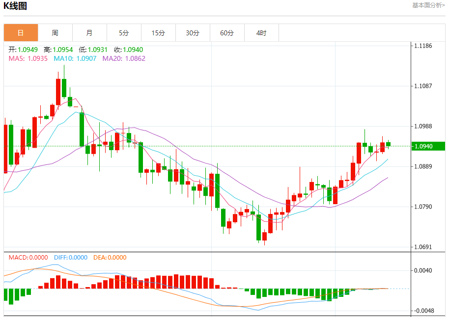 今日周四,截止目前欧元兑美元报1.0941,下跌0.07%。