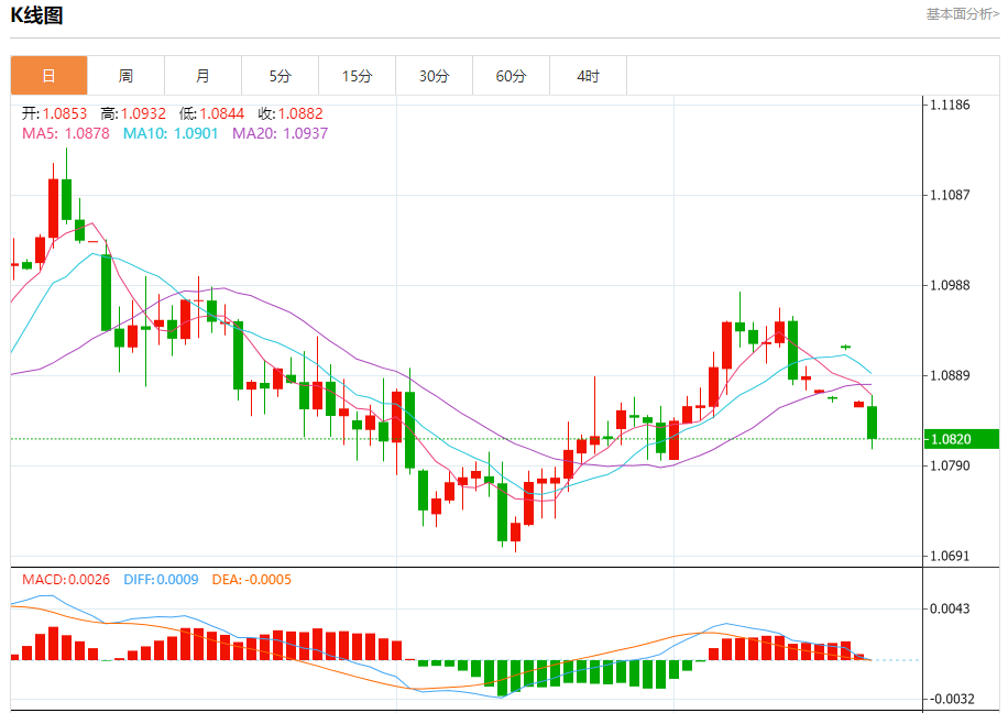 今日周五,截止目前欧元兑美元报1.0821,下跌0.36%。