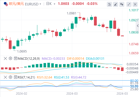 美国报告称,截至3月15日当周的首次申请失业救济人数降至21万,好于预期。此外,3月份费城联储制造业调查报告为3.2,低于前值5.2,但好于预期的-2.3。最后,标普全球公布了3月份采购经理人指数初步估计值,证实了经济的健康状况。制造业指数从2月份的52.2升至52.5,而服务业采购经理人指数则从前值52.3降至51.7。因此,标准普尔综合采购经理人指数为52.2,略低于前值52.5,但总体表明经济扩张。
