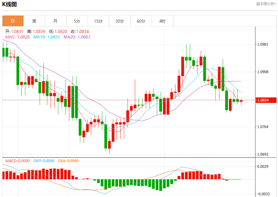 今日周三,截止目前欧元兑美元报1.0832,上涨0.01%。