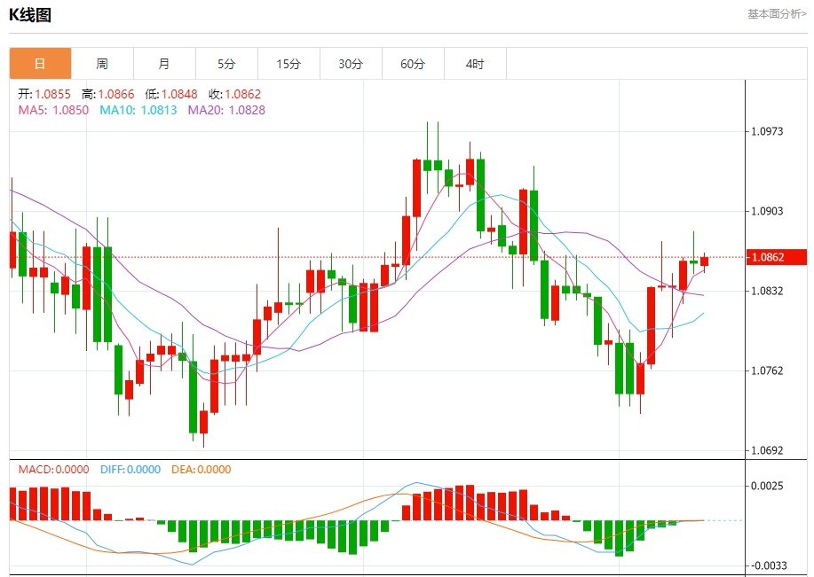 今日周三,截止目前欧元兑美元报1.0863,上涨0.05%。