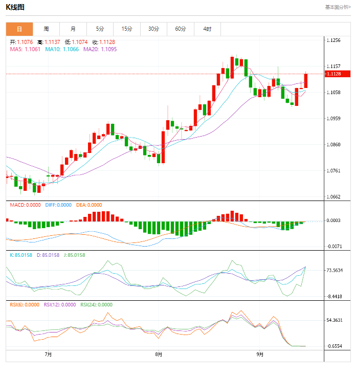 交易策略:可以在1.1115---1.1065的区间下限买入,有效破20个点止损,目标在区间的上限。