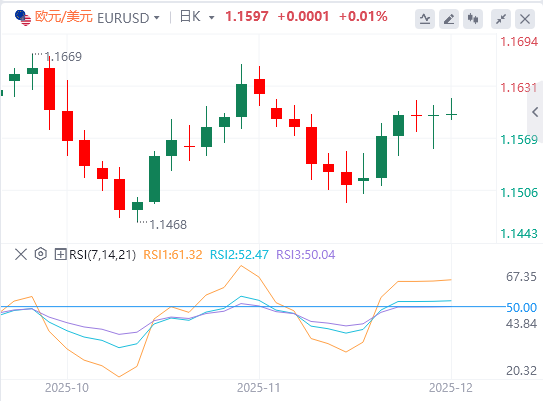 日线图中,欧元/美元报1.1593。20-EMA已稳定在1.1577附近,价格略高于其上,且略有上升迹象表明短期偏向有所改善。从1.1776开始的下降趋势线上层上升,阻力位在1.1606附近。RSI为51.8(中性),反映了中旬反弹后势头平衡。