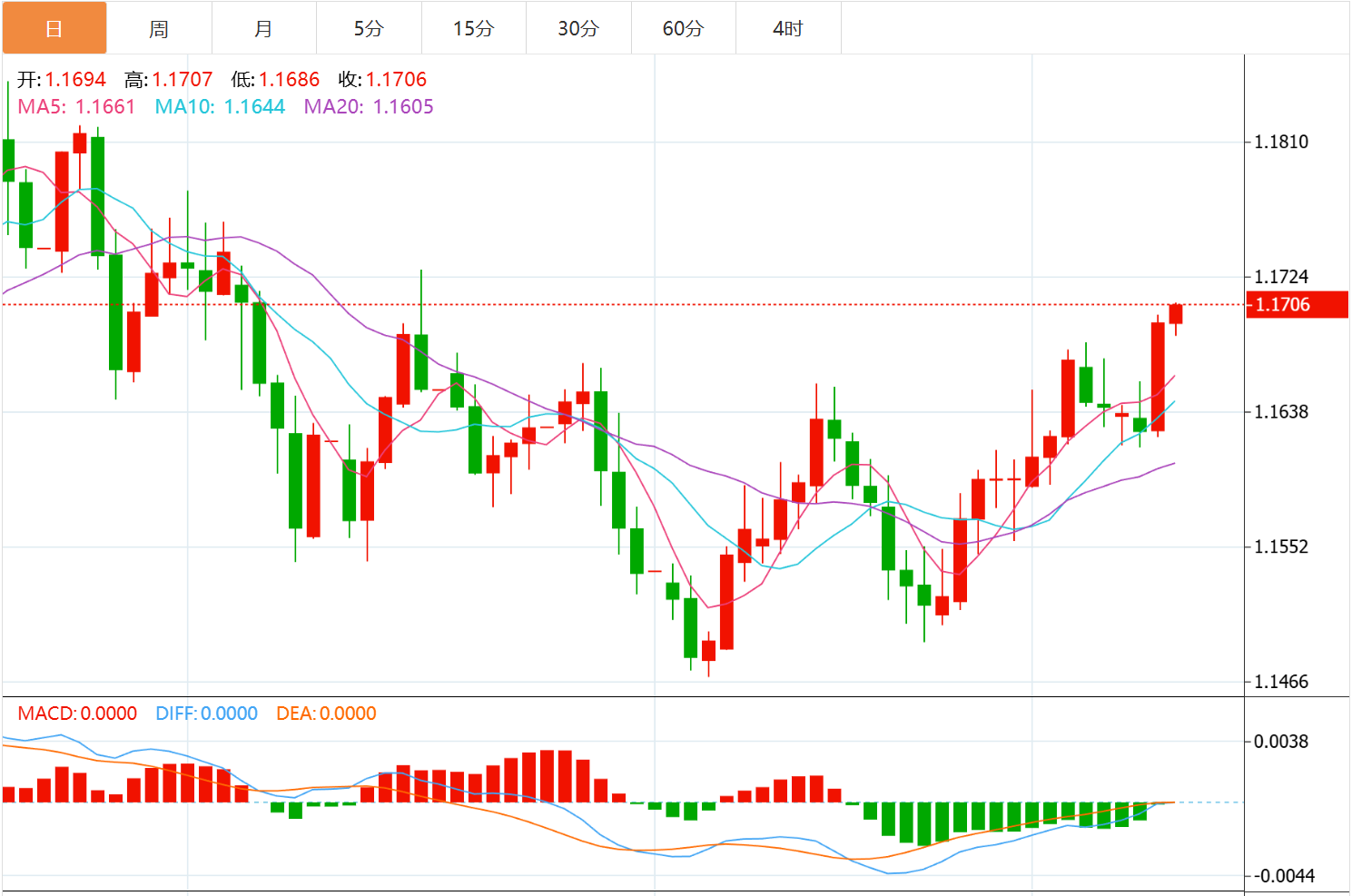 周四亚盘,美元指数走低,欧元/美元攀升突破1.1700关口,上涨0.09%。