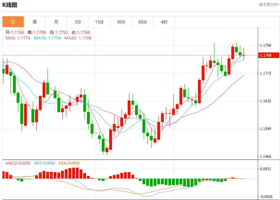 今日周一,截止目前欧元兑美元报1.1767,下跌0.03%。