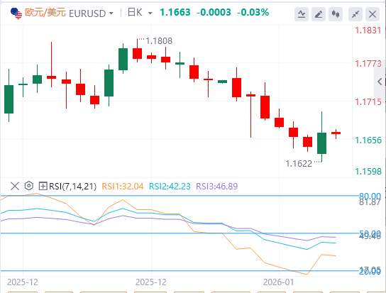 1月13日,周二欧洲早盘,欧元/美元在上一交易日小幅上涨后略微下跌,交易约为1.1660。14天相对强弱指数(RSI)动能指标位于42.69,位于50中线以下且正在回落,确认了看跌倾向。RSI接近43让卖方保持控制,不至于超卖,暗示盘整可能先行跟进。