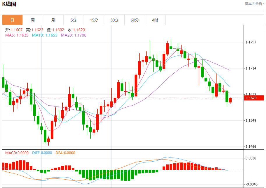 今日周五,截止目前欧元兑美元报1.1620,上涨0.10%。