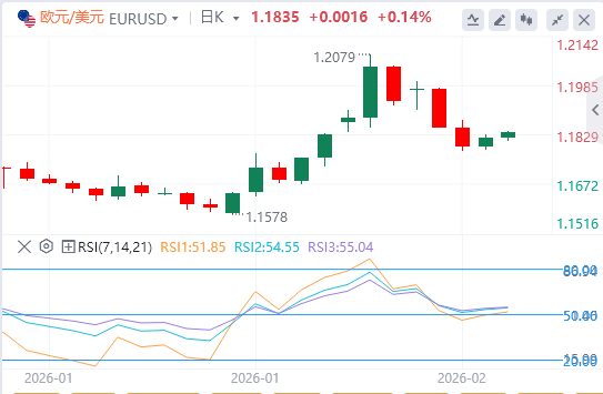 相对强弱指数(14)为45,处于中性并略有恢复,表明动能稳定但仍低于中线。 从1.1590的低点到1.2025的高点,50%的回撤位在1.1807提供初步支撑,61.8%的回撤位在1.1756以下。 上行方面,1.1858(斐波那契38.2%回撤位)可能作为第一个阻力位,随后是1.1880(50期SMA)和1.1920(斐波那契23.6%回撤位)。