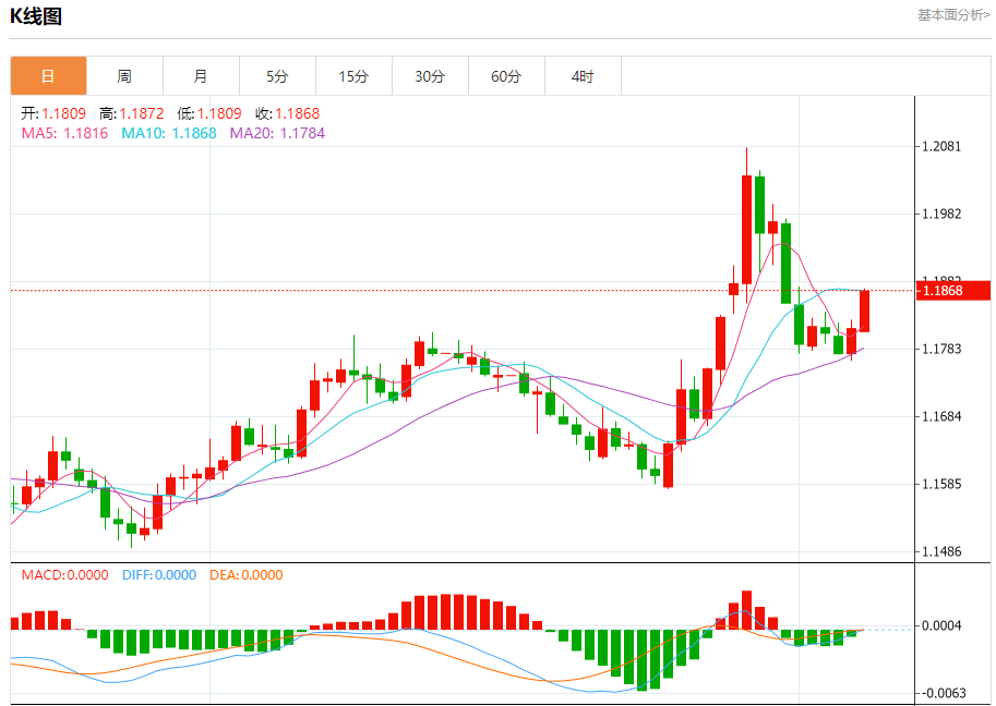 今日周一,截止目前欧元兑美元报1.1869,上涨0.46%。