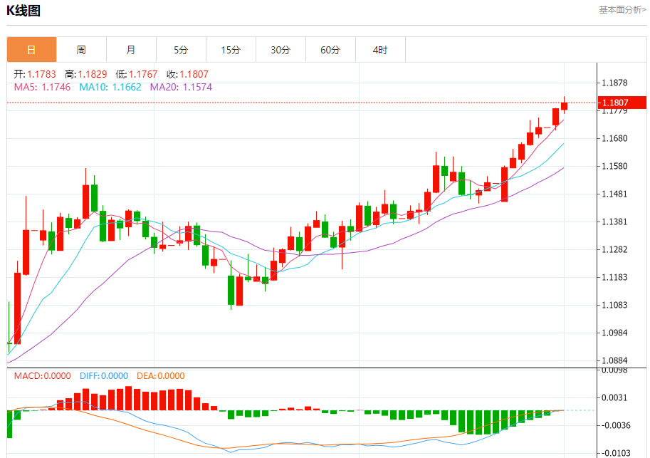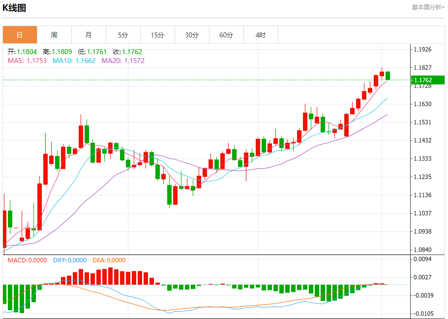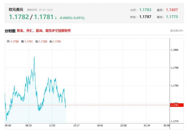 欧元兑美元今日汇率最高1.1794,最低1.1792,涨跌-0.0006,涨跌幅-0.05%。 市场基本面分析 欧洲央行管委穆勒周二表示,欧洲央行可以暂缓进一步调整利率,且在本轮周期内没有必要大幅放宽货币政策。自去年6月以来,欧洲央行已累计下调基准存款利率2个百分点,但已暗示7月将按兵不动。金融市场预计央行将维