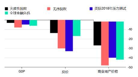 下图显示了灾难性脱欧、无序脱欧、英国央行2018年压力测试、以及全球金融危机对英国GDP增速、房价和商业地产价格的拖累程度