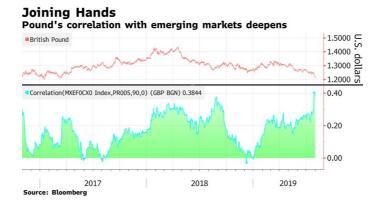 随着无协议退欧概率的上升,英镑在刚刚过去的7月录得了自2016年10月以来的最大月度跌幅,而其与新兴货币的90天相关性也已升至近三年来的最高水平。