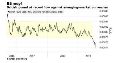 相对于新兴市场,英镑目前处于创纪录的低点。英镑汇率与MSCI新兴市场货币指数(MSCI EM Currency Index)的比值已连续第三个月下跌,因英国首相约翰逊(Boris Johnson)表示,无论是否就贸易和未来经济合作达成协议,英国都决心在10月31日脱离欧盟。
