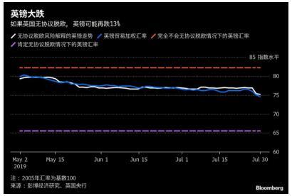 彭博经济研究的模型显示,无协议脱欧风险每增加1个百分点,英镑贸易加权汇率将会下跌0.2%。如果无协议脱欧风险降至零,英镑贸易加权汇率可能上涨9%;如果真的无协议脱欧,英镑则可能再跌13%。