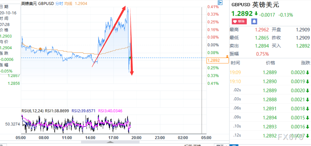 周五(10月16日)欧市盘中,英镑兑美元上演过山车行情,此前一度走升约80点至时段内高点1.2962,但随后短线跳水近百点至1.2864,因英国首相约翰逊称最新的欧盟峰会表明欧盟不接受加拿大式的协议,我们应该为明年1月的无协议式退出做好准备,此番言论导致市场对英国脱欧协商的乐观预期火速降温,此外欧美国家新冠疫情的继续反扑也打压冒险情绪,加重英镑卖压。