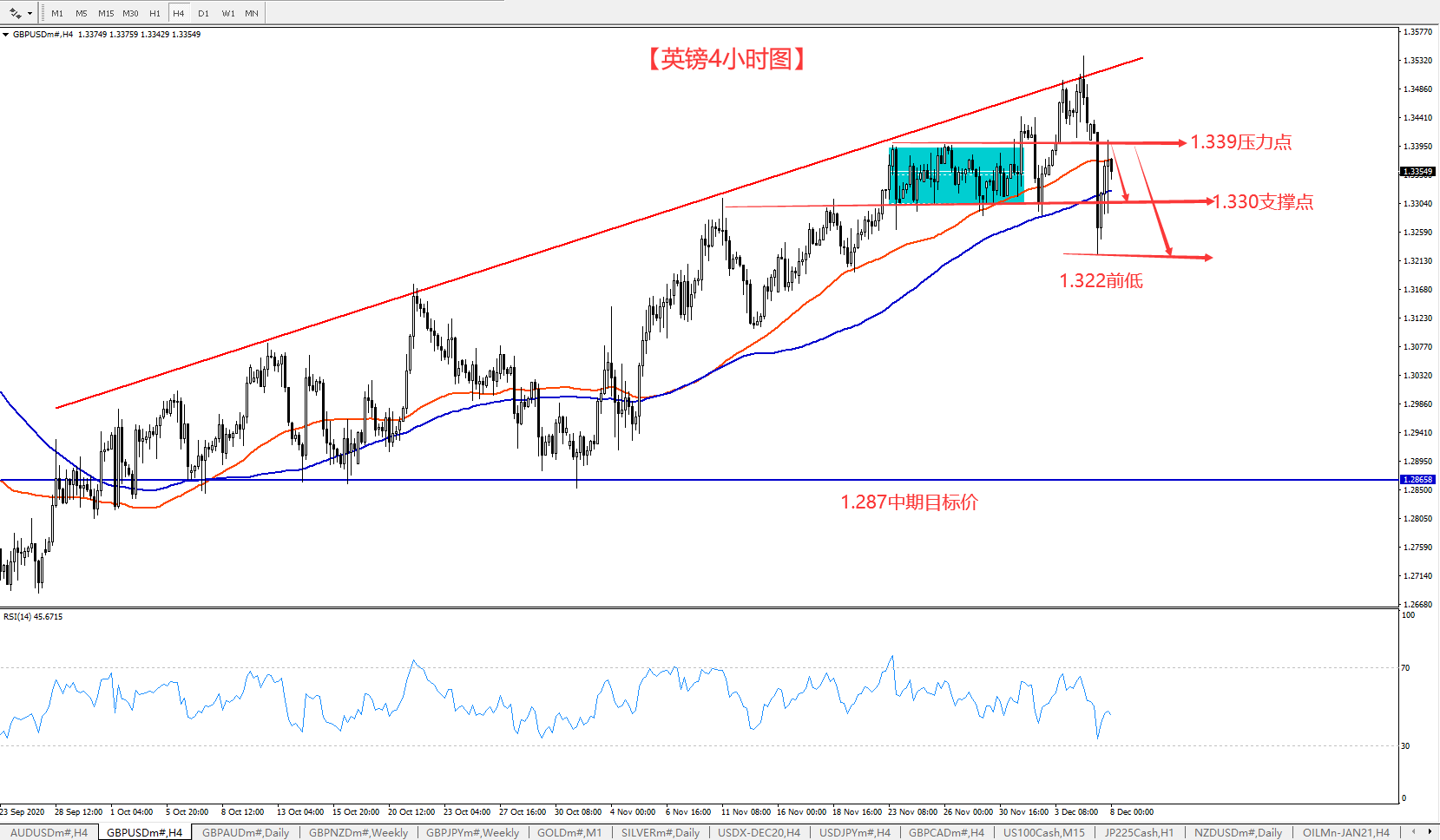 昨天的英镑,不出意料的开始往下跌,主要推动因素还是脱欧,上一个交易日欧盘早盘时段,英欧谈判再出变故,双方均表示,就脱欧关键问题上不会做出退让,在英国官方出现宣布之后,英镑开始了一段断崖式的抛售,一度自高位1.343跌至1.322关口。