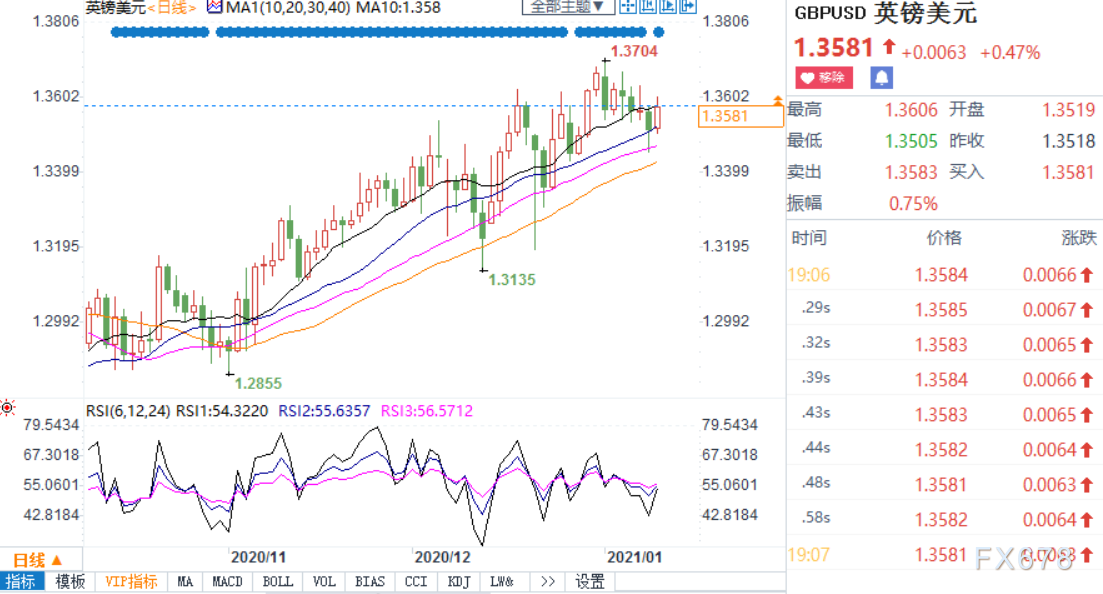 周二(1月12日)欧市盘中,英镑兑美元加速反弹升破1.36,升至两日新高1.3606,英国央行行长贝利讲话也弱化了投资者对英国央行提前实施负利率的顾虑,此外美元指数再度走疲也支撑了英镑。