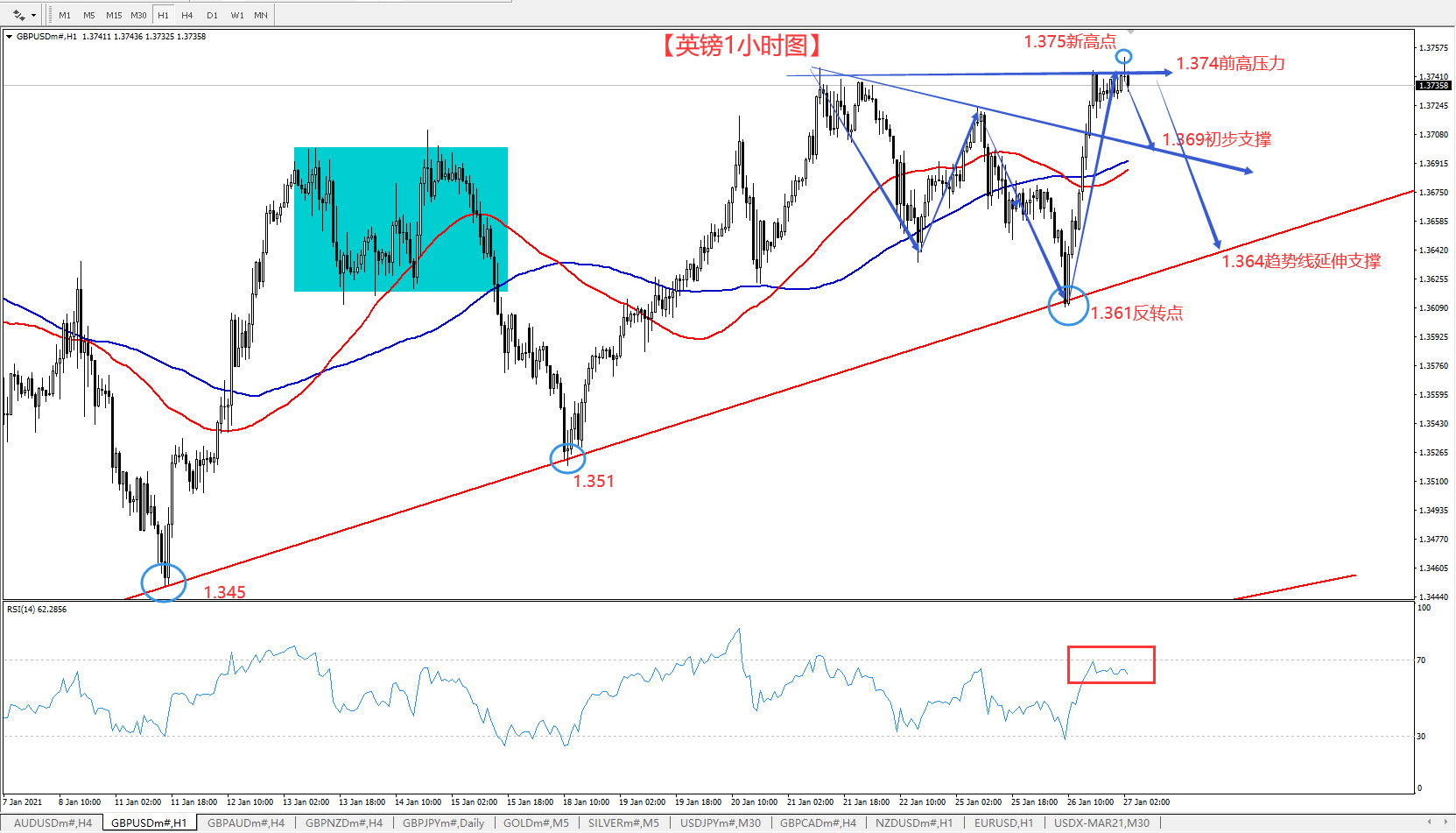所以,今天的英镑,还是要看待高位回落,回落点关注1.369的支撑和上行趋势支撑1.364,也就是说,在1.374这个点继续做空英镑,短期目标1.369-1.365两个点,破位将继续跟进,防守关注前高上1个点1.376即可,小止损摸顶。