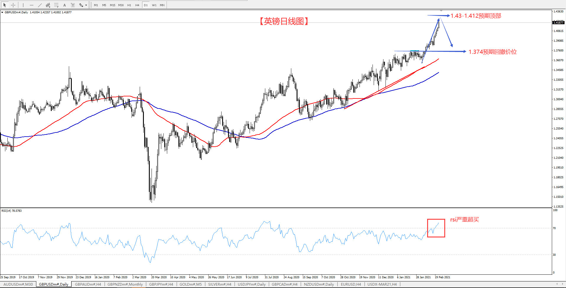 技术面来看,英镑日线自月初阶段的英银利率决议过后,就一直维持一个单边的姿态,虽说期间出现过反转信号,但是结果是英镑接连5个交易日的阳线拉升,不过我并不看好这段行情能够延续抬升,在整个2月份,英镑几乎一直处于单边抬升的状态当中,中间并没有什么回调,并且rsi指标已经冲破70%,目前已经触及到了80%,已经到了严重超买的阶段,随时有进一步回撤的风险。