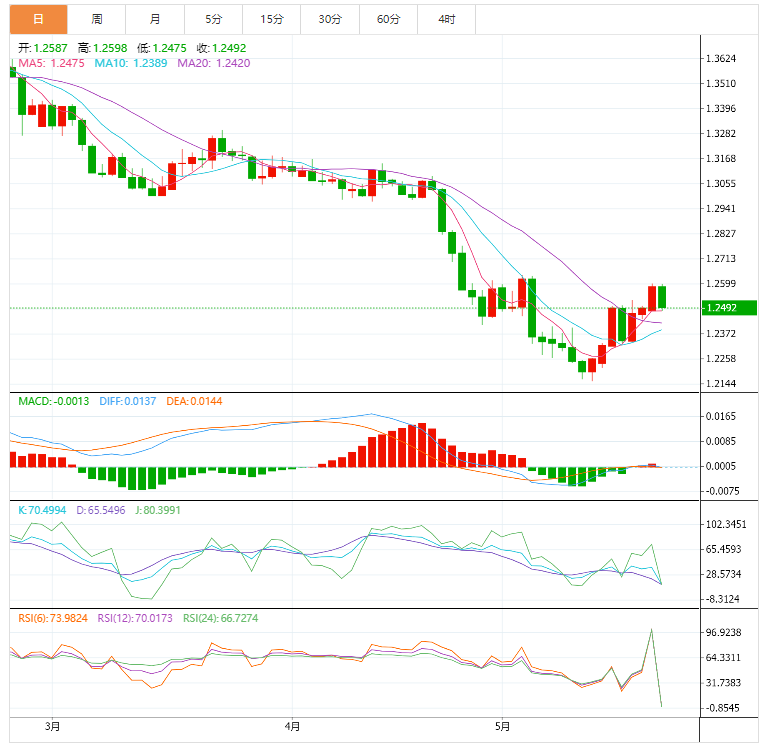 2、5月经季节调整的标准普尔全球/CIPS英国制造业采购经理人指数(PMI)大幅降至54.6,低于预期的55.1和4月终值55.8。英国采购经理人指数(PMI)调查数据显示,5月份经济增长速度严重放缓,前瞻性指标暗示,情况还将恶化。与此同时,随着企业成本增长率再创历史新高,通胀形势进一步恶化。在英国PMI发布之前,英镑兑美元在1.2590附近交易稳健。