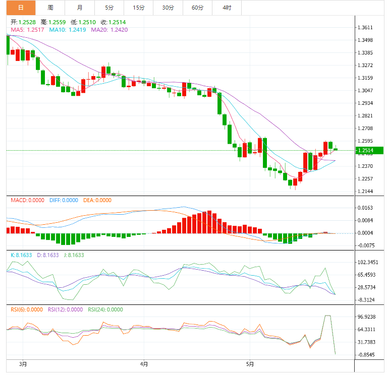 2、汇价在200EMA均线1.2600遇阻,若升破1.2465附近的50EMA均线将确认短期看涨势头。若回调接近50EMA均线1.2465,则回应性买盘行为将推动汇价升向周一的高点1.2601。突破该位将促使汇价升向4月24日低点1.2698。相反,若跌破5月19日低点1.2330将拖累汇价跌向3月6日低点1.2261和3月13日低点1.2155。