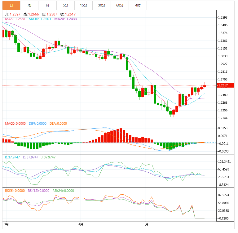 1、英镑突破3月23日高点1.3300至5月13日低点1.2155之间跌势的38.2%斐波回档位1.2590,这视为看涨反转。汇价企稳于200EMA均线1.2613上方,增加上行动力。此外汇价也企稳于50EMA均线1.2500上方。