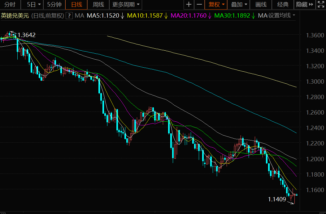 英镑/美元隔夜跌至1.1405,而衡量美元兑一篮子货币的美元指数飙升至新的牛市周期高点110.786,处在2002 年以来周线高位紧下方。英镑/美元波动方面,英央行决议将成为一个关键事件,因为英国通胀已经数月维持在高水平。