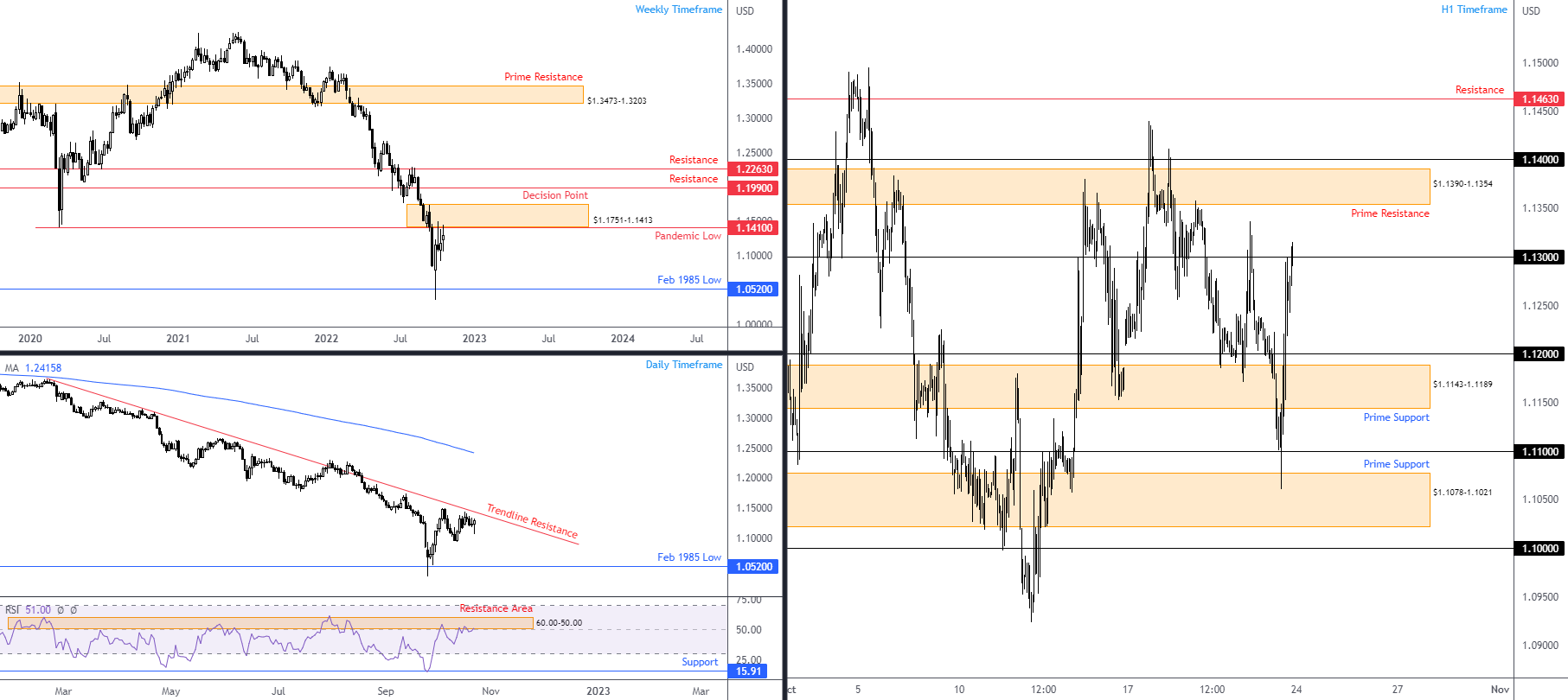 每周和每日时间框架的技术阻力,19个月的下降趋势和每日RSI阻力表明,任何上行努力都可能是短暂的。因此,上半年时间框架上高于1.13美元的鞭打可能会形成,这可能会鼓励卖家从1.1390美元至1.1354美元的主要阻力位进入市场。如果这一点得以实现,并且我们回到1.13美元以下,上半年时间框架的主要支撑位随后可能会欢迎1.1143-1.1189美元的价格走势。