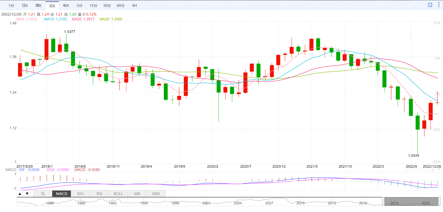 月度图表显示,英镑兑美元的复苏势头在1.2320上方动摇,1.2320是整个下行趋势的50%斐波那契回撤位(Fibo)水平,从2021年6月的峰值1.4248到2022年9月的低点1.0339——几乎是40年的低谷。