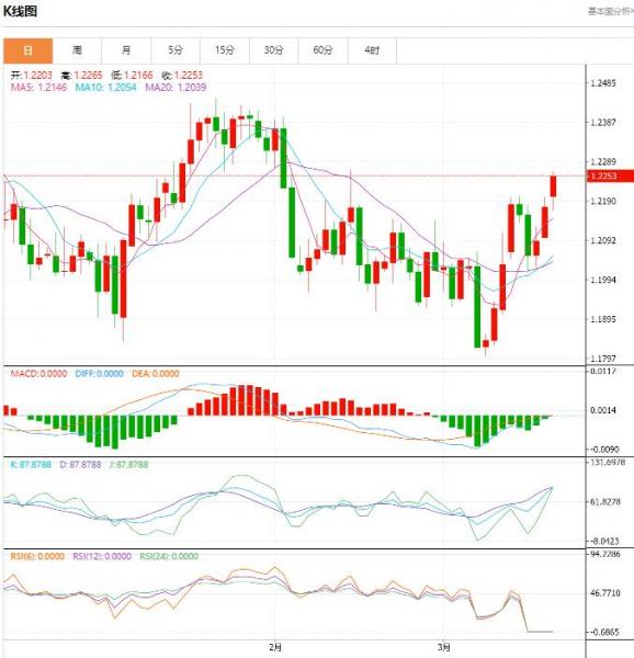 行情分析:汇价高见1.2265,低见1.2166。上一交易日,汇价收于1.2176。基本面上看,上周五英镑震荡上行,日线小幅收涨,除美元指数在美联储加息预期降温和市场的避险情绪降温等利空因素的打压下刷新4周低位对英镑构成了有力的支撑外,日前英国公布的预算案也持续对汇价构成了一定的支撑。技术上,小时图反弹动能维持良好,但随机指标熊背离,对进一步上行空间保持谨慎。4小时图在1.2000上方企稳反弹,当前测试前期高点1.2200一线,该档为短线强弱分水岭。日图测试近期整理高点1.2200一线,关注能否有效站上该档。