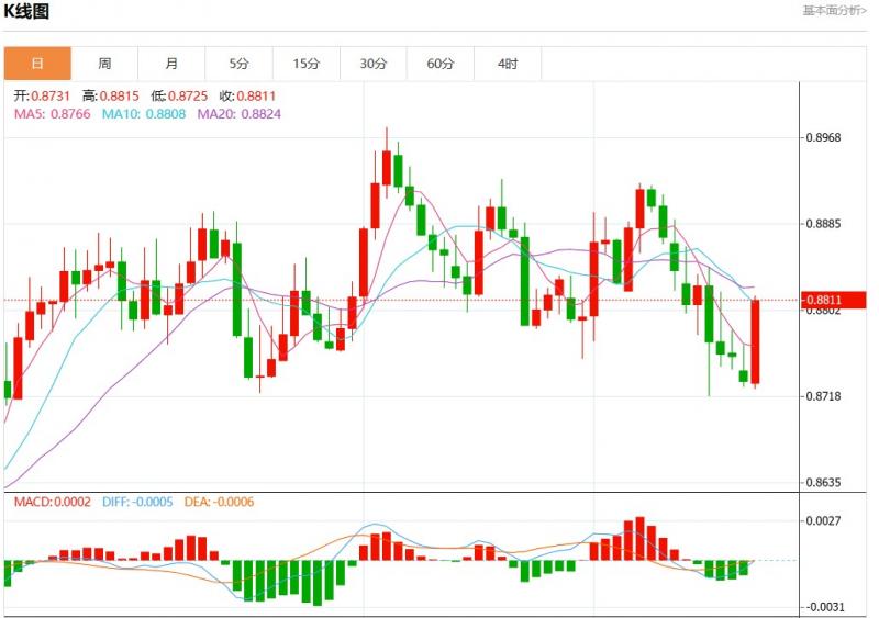 周二欧市盘中,欧元/英镑 报0.8810,涨幅0.88%。