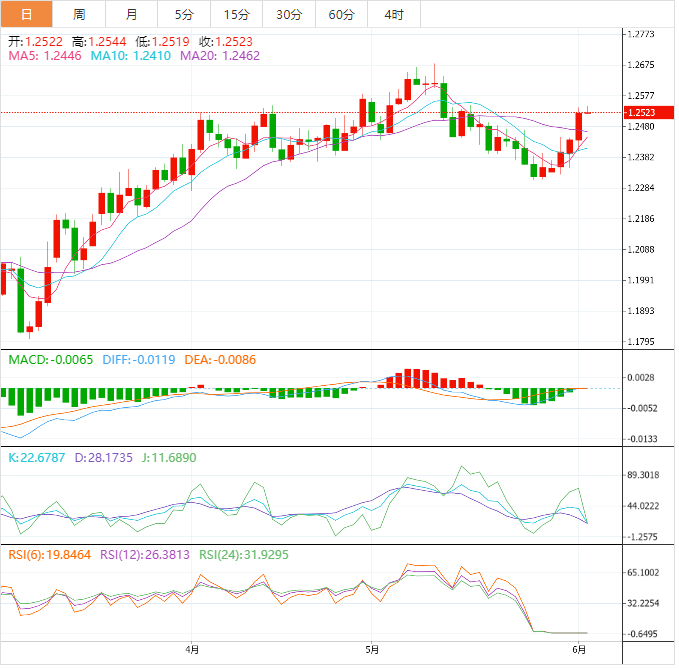 英镑基本面:周五最为重要的美国非农报告即将公佈,英镑兑美元多头咋暂时观望。该货币对在6日上涨期间于1.2535附近温和上涨,近期试探了5月16日以来的最高水平。值得支撑的是,英镑成功升破200SMA均线1.2475令多头充满希望。不过,在RSI线超买之际,自4月14日以来的多重水平区域形成了1.2540-50的阻力区域,进而挑战英镑兑美元短期上行。