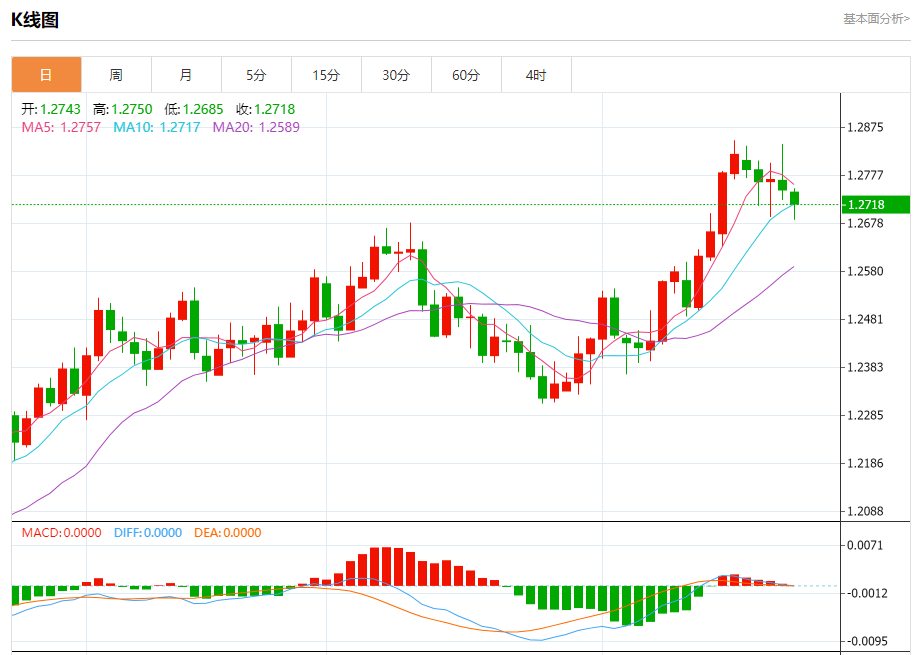 周五欧市盘中,英镑兑美元交投于1.2719,跌幅为0.22%。