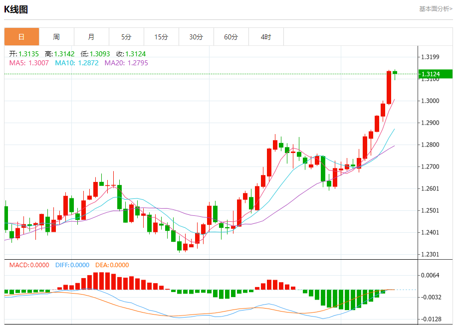周五欧市盘中,英镑兑美元交投于1.3125,跌幅为0.08%。