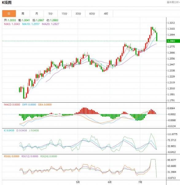 汇价高见1.3041,低见1.2867。上一交易日,汇价收于1.3035。基本面上看,英镑昨日震荡下行,日线小幅收跌。除获利回吐持续对汇价构成打压外,在英国通胀数据即将公布前,投资者保持警惕也对汇价构成了一定的打压。此外,美元指数在空头回补和美联储7月份仍有加息预期的支撑下止跌企稳也对汇价构成了一定的打压。技术面上看,英镑兑美元H4级别遇阻回落,价格似乎暂时不能进一步向上突破。MACD双线和量能柱都已出现超买回调形态,不排除空头可能会继续向下测试。