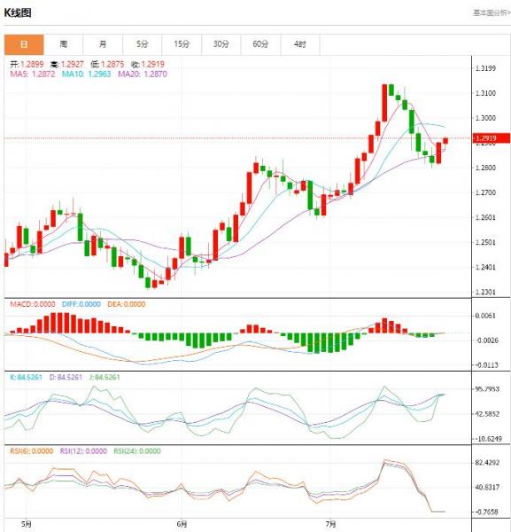 汇价高见1.2864,低见1.2809。上一交易日,汇价收于1.2821。基本面上看,英镑昨日震荡上行,日线小幅收涨,现汇价交投于1.2880附近。除空头回补和1.2800附近所形成的技术面买盘对汇价构成了一定的支撑外,美元指数在美联储7月利率决议前回落收跌也对英镑构成了一定的支撑。此外,时段内英国表现良好的经济数据也对汇价构成了一定的支撑。技术面上看,英镑H4级别在1.2800美元附近反弹,目前在48日多空分界线附近徘徊。随着英国面临经济增长和通胀方面的考验导致加息放缓,英镑不排除再次下行。